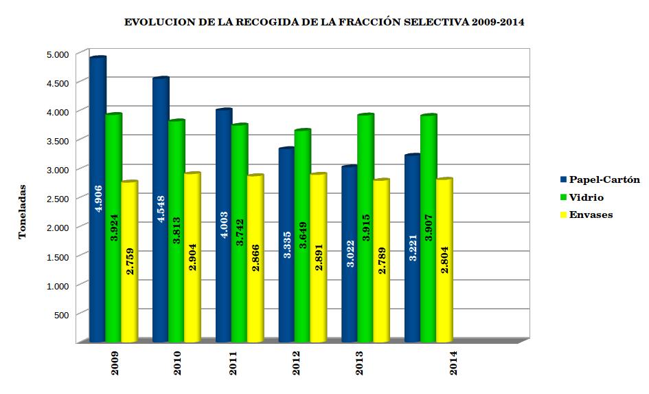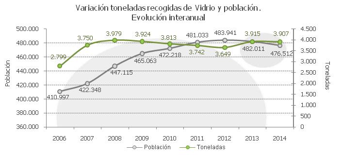 Los gráficos muestran la evolución en los últimos años de las toneladas de Envases, Papel-Cartón y Vidrio recogidas comparándolo tanto con la población como con el ratio de kilogramos por habitante y año.